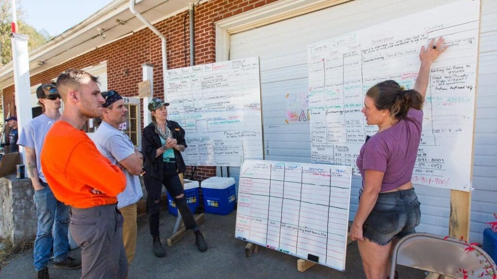Natalie Bogwalker, founder of Wild Abundance (r), coordinating efforts to recover from Hurricane … [+] Helene in her town of Barnardsville, NC. Helene was a natural disaster of epic proportions and left many in North Carolina without homes.